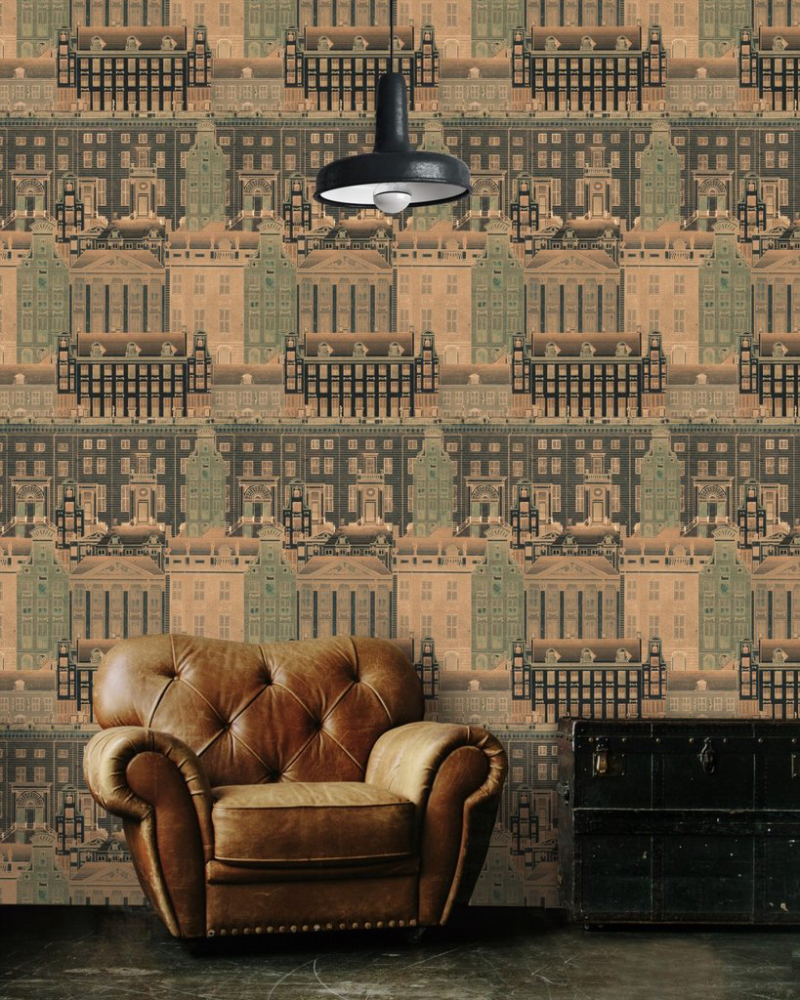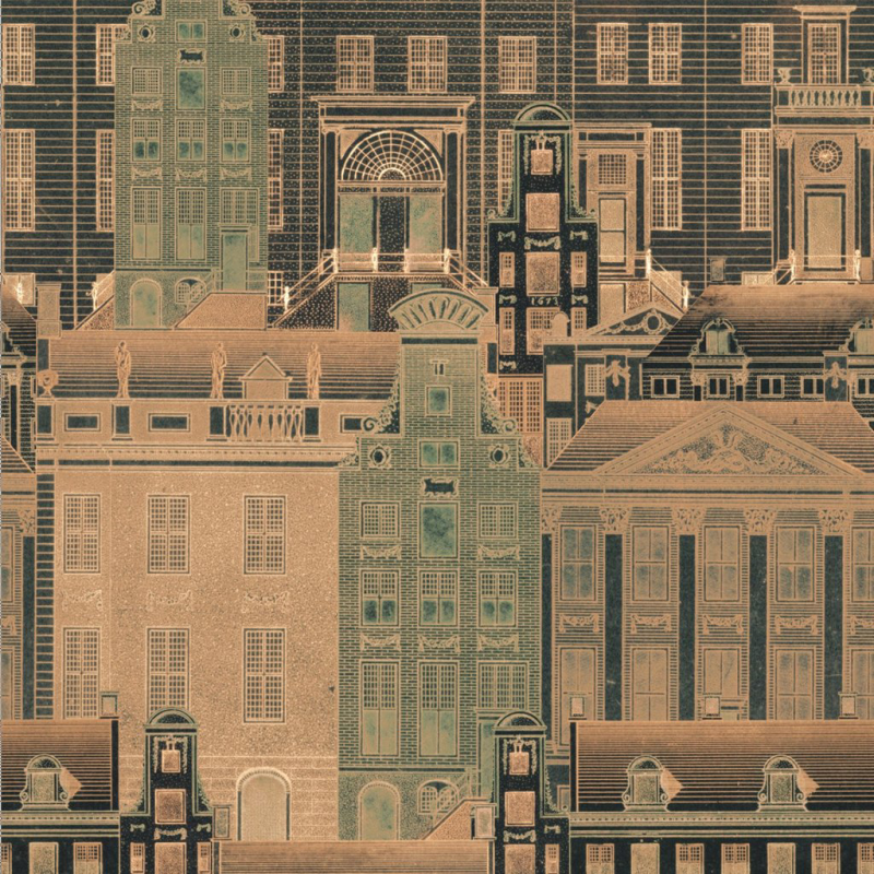 Collage with warm colors, featuring urban architectural elements from Amsterdam.