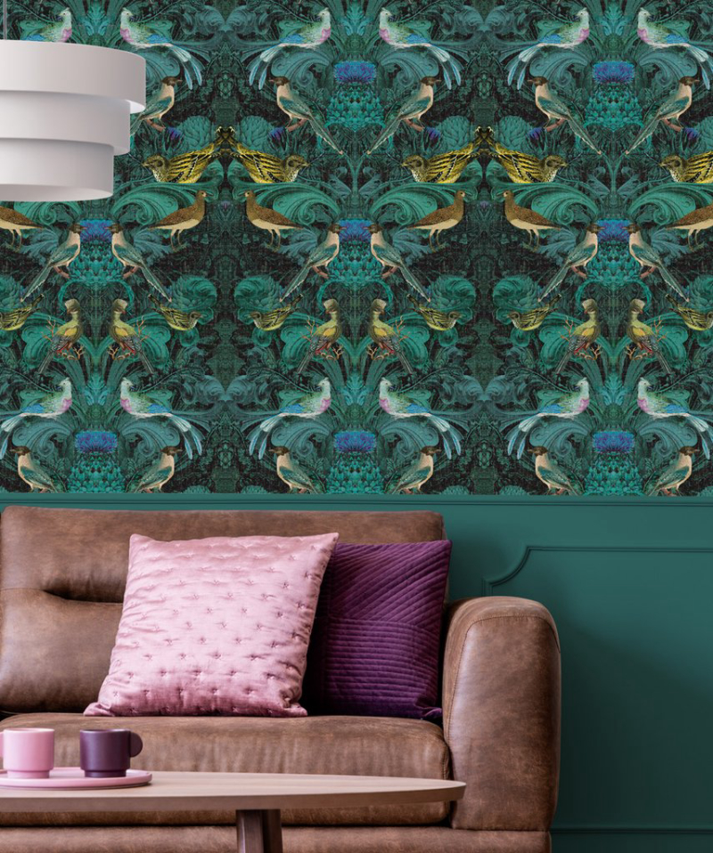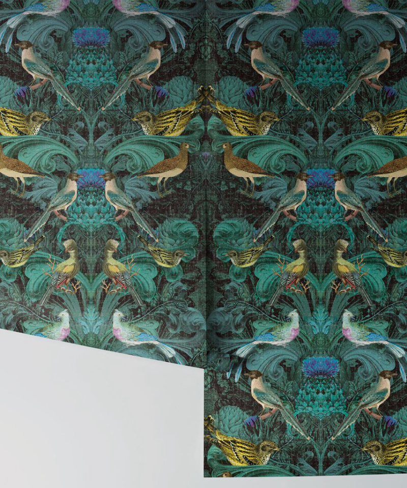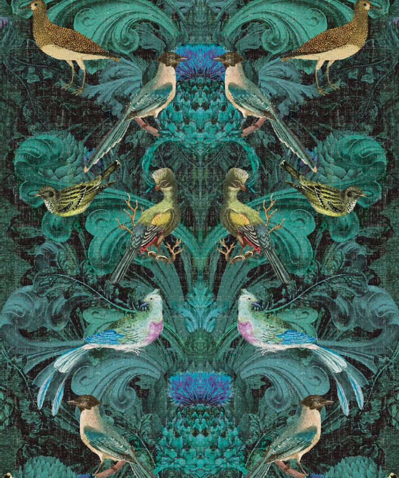 A modern baroque wallpaper design combined with a flamboyant avian theme. The rich pallet lends to a bold, decorative statement on a grand scale, perfectly suited for large residential or commercial spaces. Decorative birds inspired by prints and etchings of a bygone era perched upon a dense and lush leafy background of roman acanthus leaves and stone baroque garden ornamentation. An eclectic take...