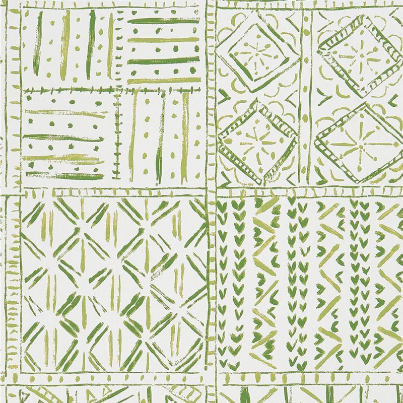 Painterly brushstrokes form informal geometric patterns within squares. The design is printed on a textured fibrous ground.