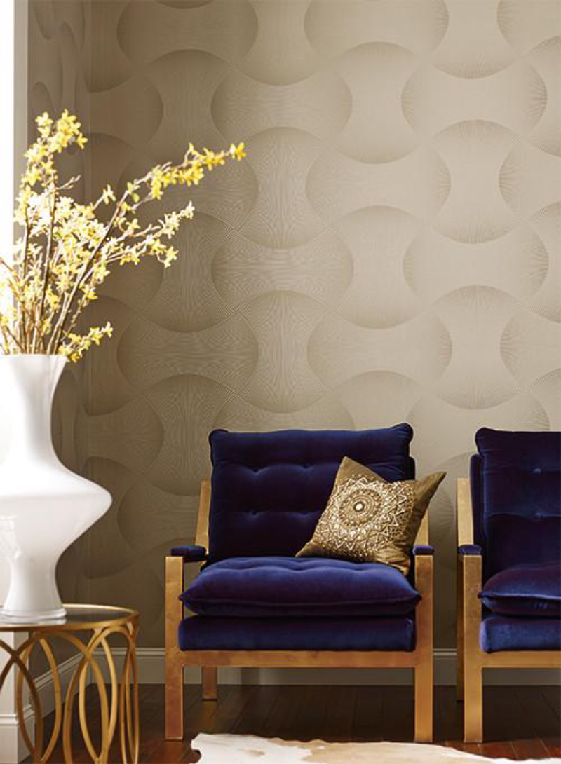 This arresting wallpaper brings a myriad of diverse techniques to bear. The extremely large design consists of geometrical shapes with narrow parallel curved lines that taper to pinstripes then flare slightly once again. Printed with metallic and matte inks with ombre shading, the effect is a unique woven look that is appropriate for vast open contemporary or post-modern spaces.