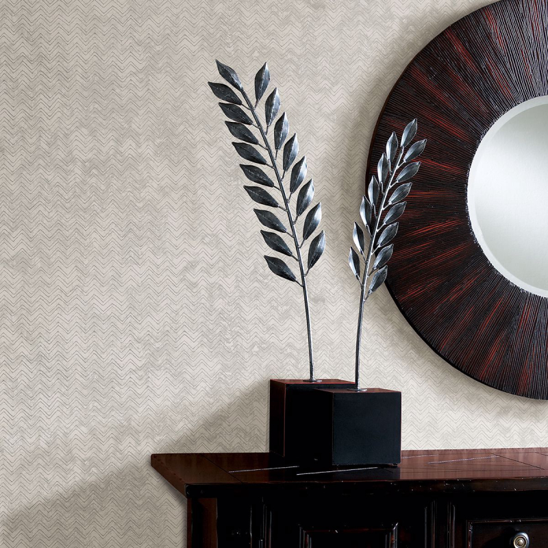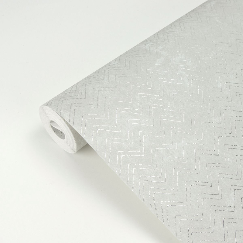 Invite luxury into your home. This off-white chevon design has silver accents that create a dazzling effect for walls. Luna is an unpasted, non woven wallpaper.