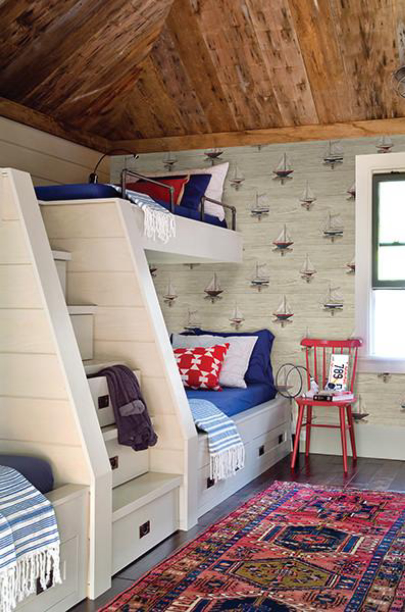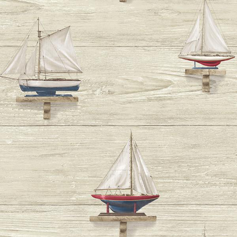 Take a walk on the nautical side with this sailboat wallpaper. A shiplap background is the perfect addition. Navy and red accents add a touch of color.