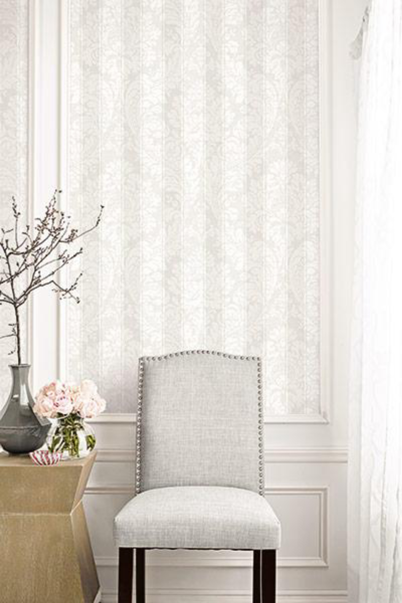 Traditional framed damask wallcovering with full stripe and written script throughout. Perfect for a Traditional and Contemporary setting found in a Dining Room or Sitting Room. Iridescent and Raised Ink details adding shine and texture to paper. From the Spring Garden Collection: Fresh florals and soft colors come together to create a bright and clean look that emphasizes a new contemporary cottage...