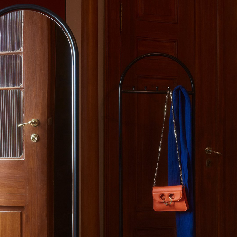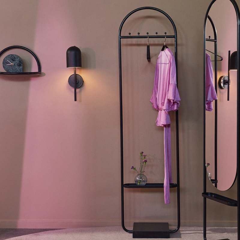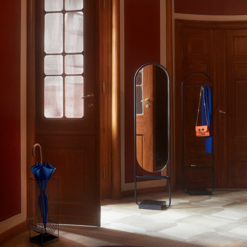 A beautiful addition to any entrance, hall or even bedroom you can imagine. The elegant oval shape of the frame is solidly placed on a marble base and are functional, stable and decorative at the same time. The clothes rack has a small shelf for all those little things you need a place for. The Angui collection is a beautiful range of different furniture. The collection includes benches, chairs, shelves...