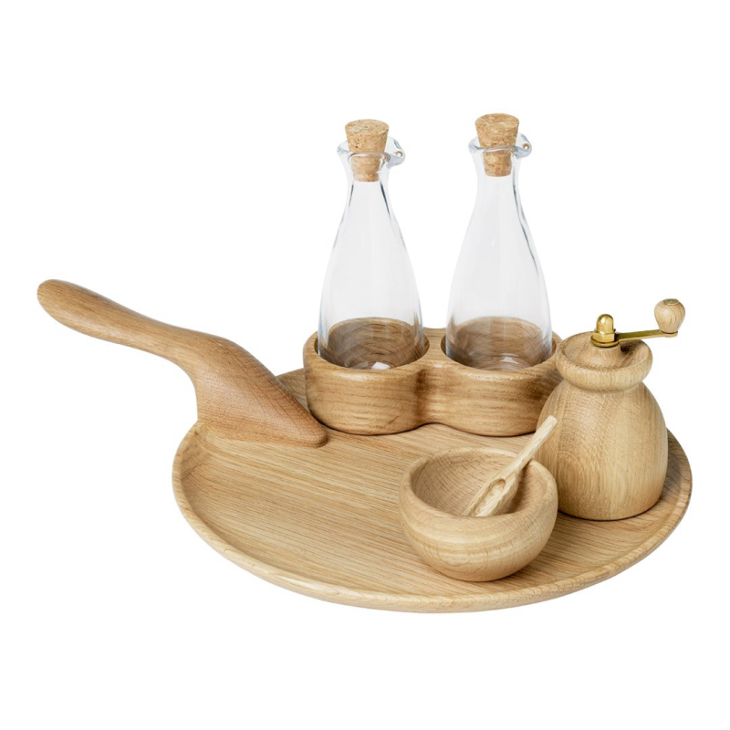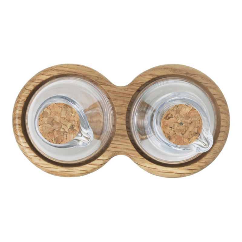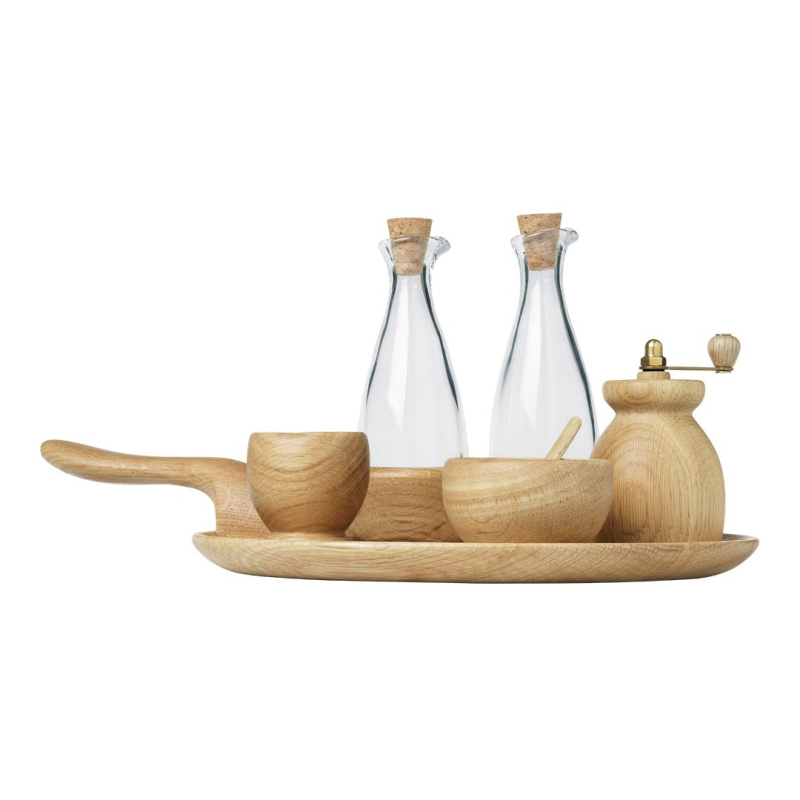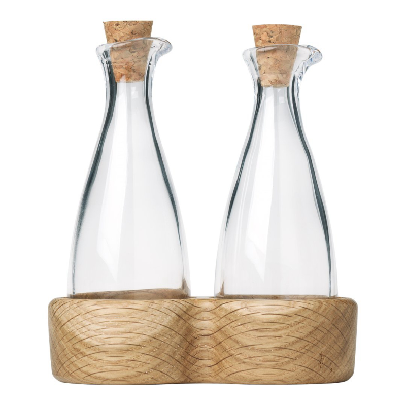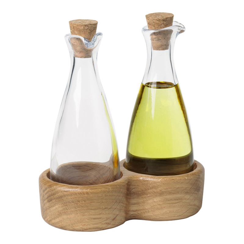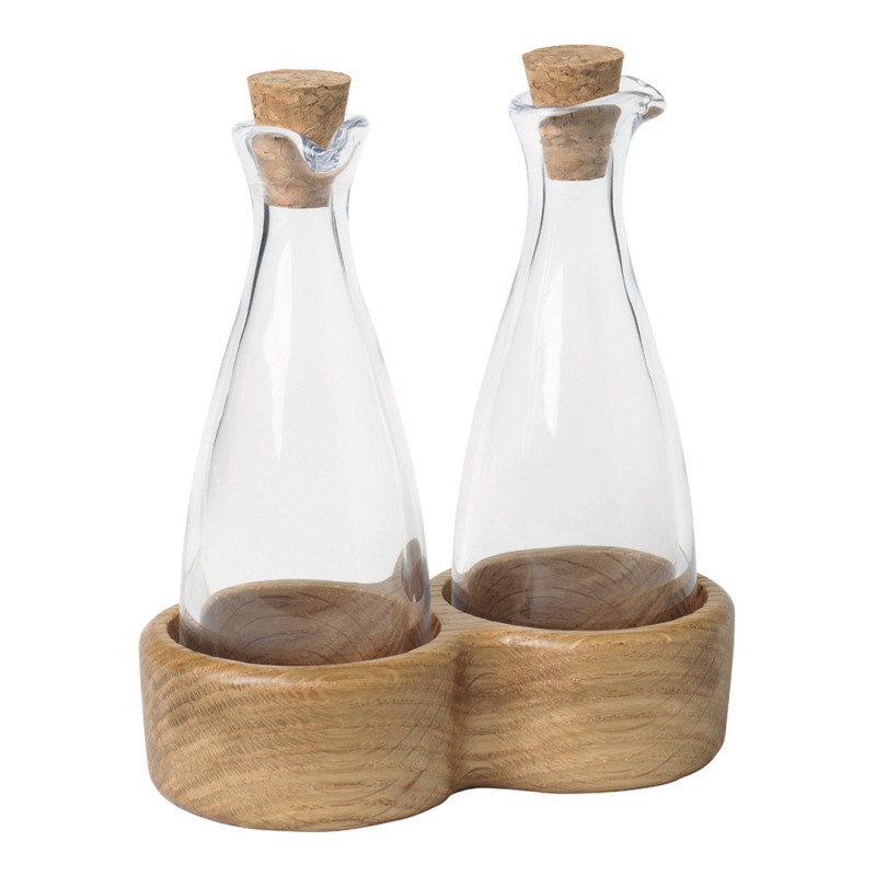 Beautiful oil and vinegar set from Kay Bojesen’s Menageri range, designed back in the 1940s, when Kay Bojesen began making elegant, useful wooden household items. The mouth-blown glass oil and vinegar bottles stand 8 cm tall, and have a cork stopper and a broad, finished oak base. The finish makes the wood less susceptible to food stains, so they are perfect for everyday use in the kitchen. The set...