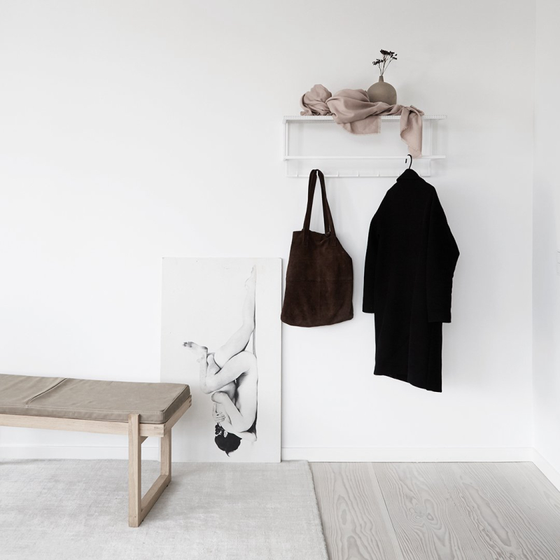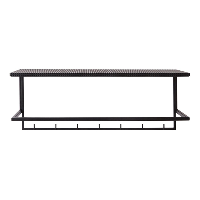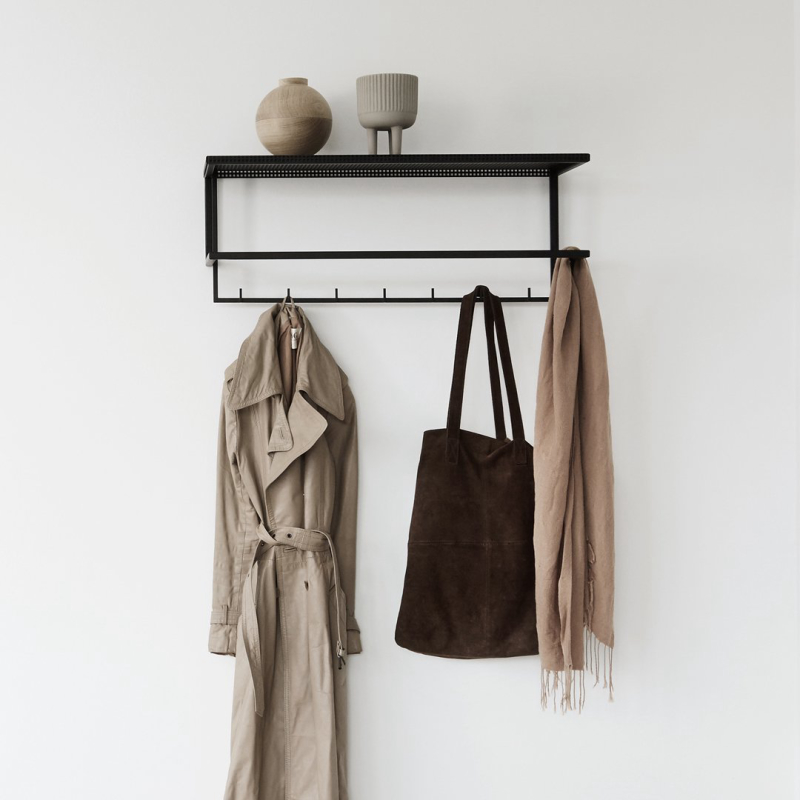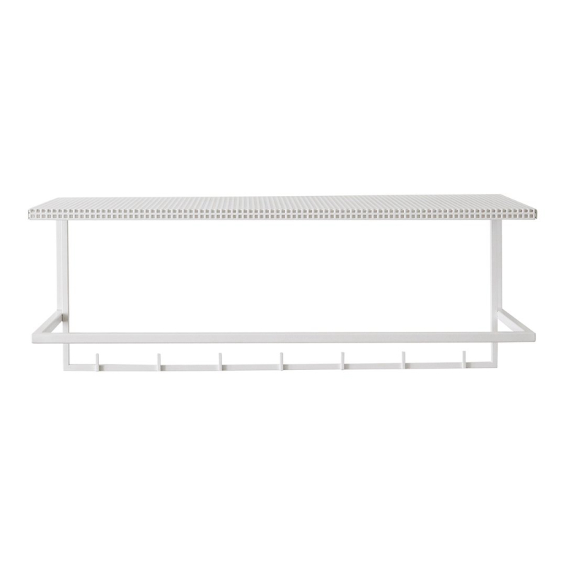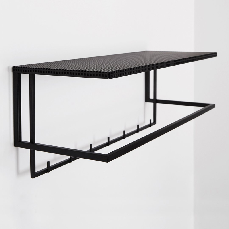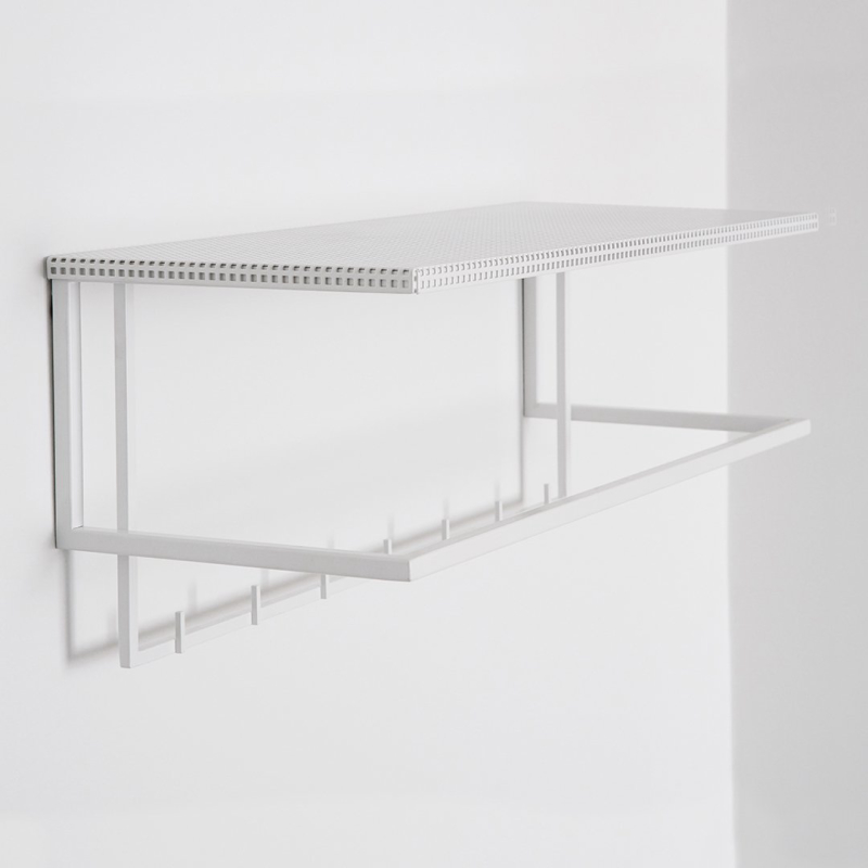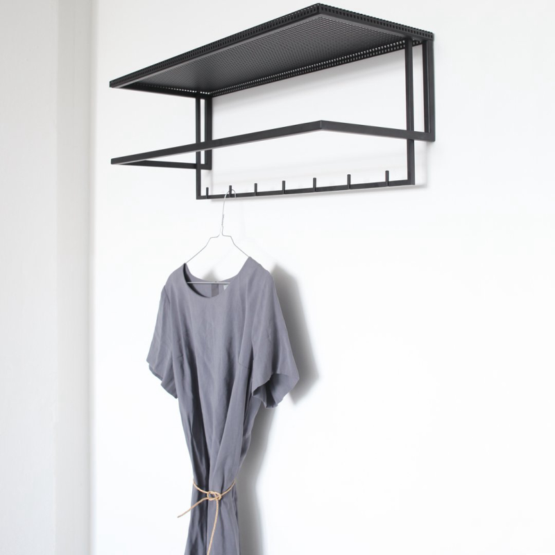The simplest and easiest way to store your coats and jackets. This elementary and archetypical design is both, a beauty and a space saver in your hallway. Place your hat on the perforated steel top or display your favorite art piece. The Grid Wall Hanger will elegantly fit in every hallway and is available in black and white powder-coated steel.