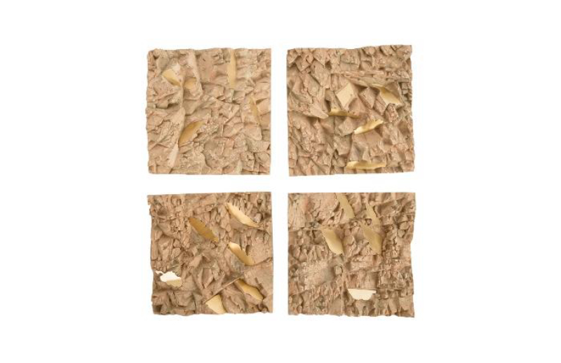 Inspired by flecks of gold found in caves, the Rubble Wall Tiles showcase hand cut brass imbedded in a cast stone resin. Display multiple on the wall in a grid or try a freeform pattern for a dramatic look.