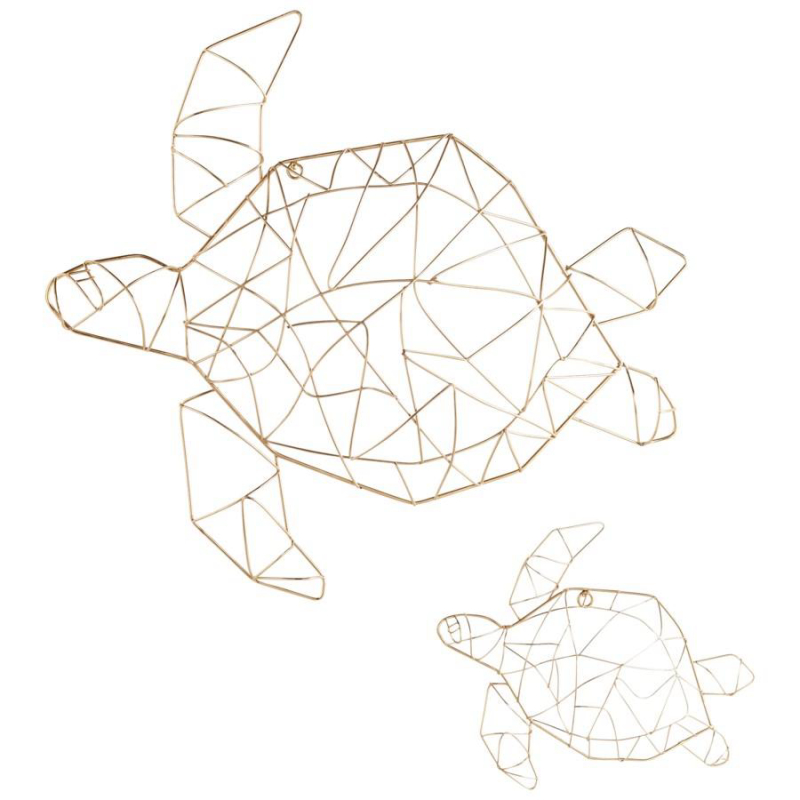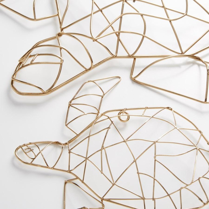 This whimsical wall art piece is part of a larger collection of marine inspired, abstract designs. Open aired and geometrically inspired, the Soft Shell wall decor boasts a sleek gold finish on its linear look, formed to resemble a tortoise. This piece is perfect for any child's room with an oceanic theme, coastal...