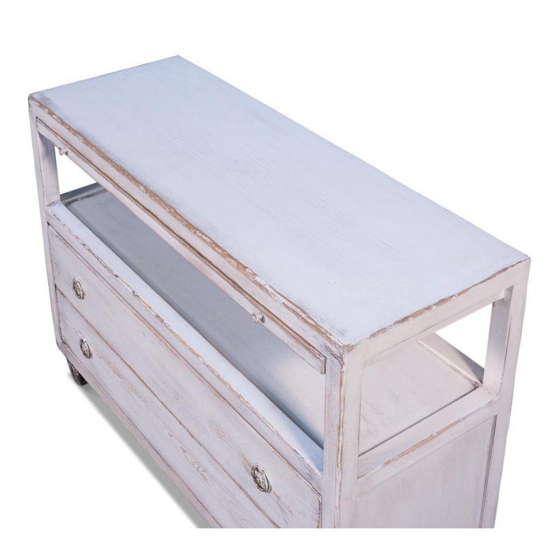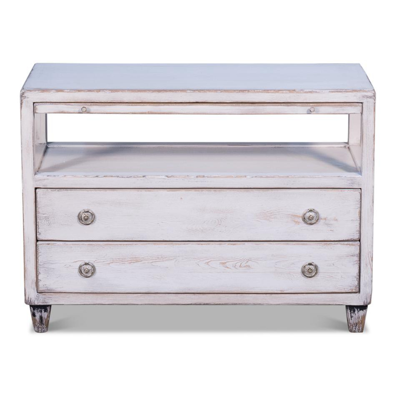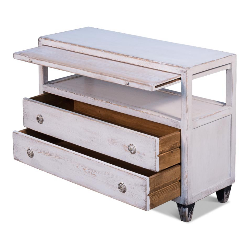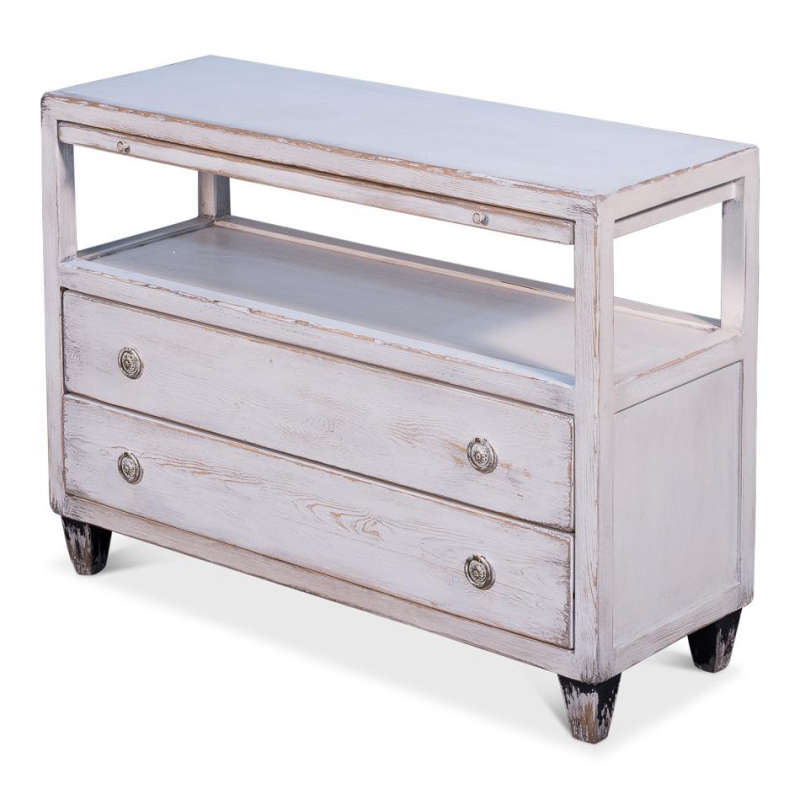 Except for the Hollywood name, this is a fairly understated TV stand. Simple lines. Drawers and shelves for storage. Contrast block legs. France and Son is an authorized seller of this product.
