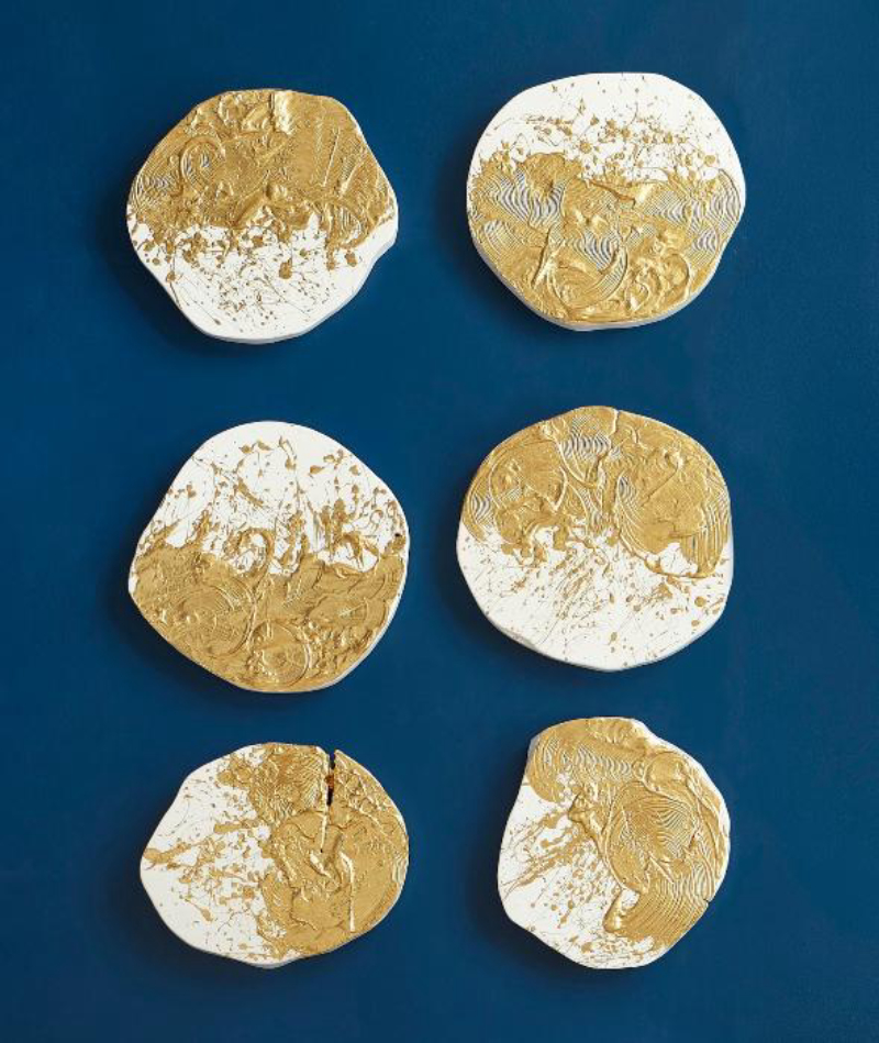 Thai artist, Chittra Han, known for her brilliant trailblazing works on canvas, painstakingly applies silver and gold leaf onto organic wood slices for the first time to create dazzling three-dimensional wall sculptures. Each piece is handmade, and the style and accents may vary from piece to piece. France...