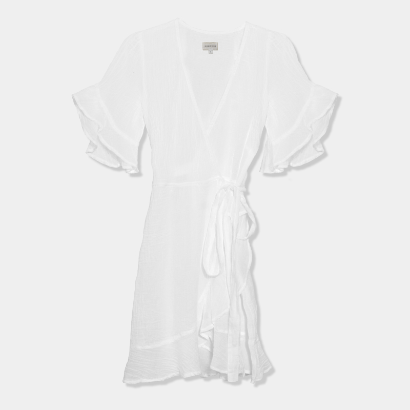 DescriptionV-neck, mini, wrap cover-up with self waist tie and ruffle-finished short bell sleeves and hem. 100% Cotton Size Small measures 34 1/2’’ from shoulder to hem