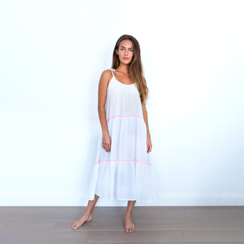DescriptionTiered, long cover-up with adjustable self-tie shoulder straps, on-seam side pockets and neon pink embroidery detailing. 100% Gauze