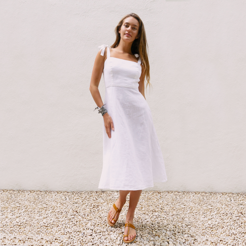 DescriptionA mid-length dress with Princess seam bodice, Featuring an A-line skirt, wide tie shoulder straps, a zip back and hook-and-eye closure. 100% Linen *ALL SALE ITEMS ARE FINAL SALE*