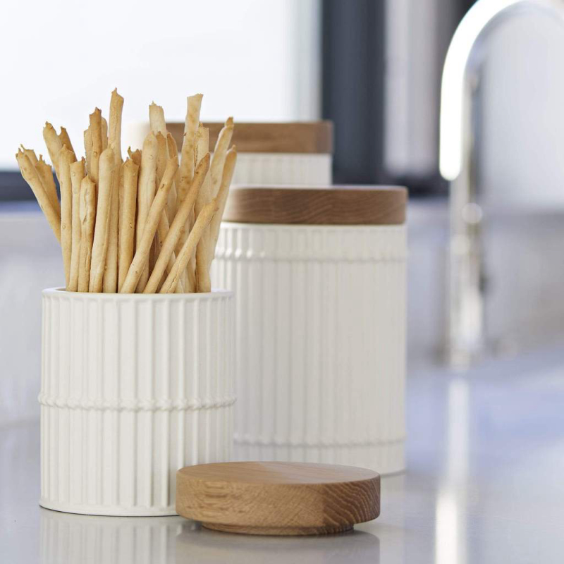 Palm Canisters Set of 3The set of three Palm Canisters was inspired by a simple versatile pencil cup while its soft matte finish and ivory glaze are a nod to the earthenwares of Japanese ceramic tradition. A rattan motif with horizontal bands adds subtle interest and texture alluding to Classical columns. With a teak top the canisters are ideal storage in a bathroom or kitchen or as beautiful vessels...