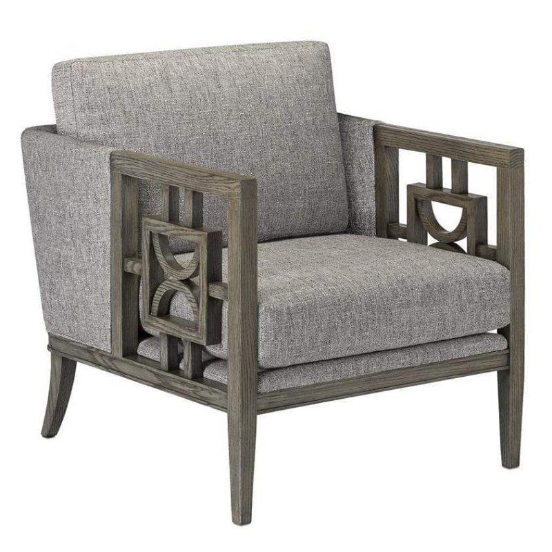 Director of furniture Aimee Kurzner says of the Royce Silver Gray Chair, “I really love this exposed wood front with solid wood fretwork.” The gray chair has loose seat and back cushions, and a fully upholstered seat deck. The chair is made of solid oak with our Winter Gray finish, which has tremendous character to it. The Royce, which is upholstered in F0236 Swagger Silver fabric, also comes in muslin.