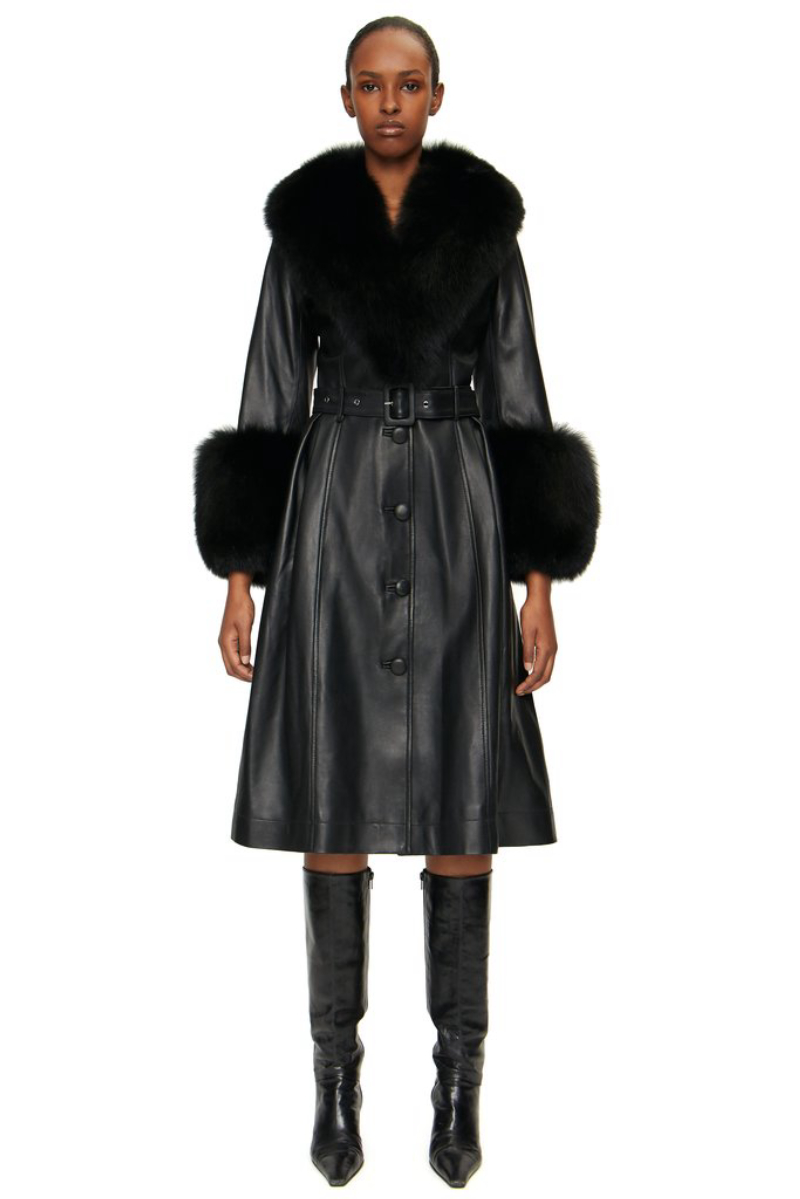 The foxy coat is a signature style by Saks Potts The elegant silhouette is an expressive, yet, timeless piece Features high-quality lamb leather and ultra-fine fox fur trimming Waist belt, button fastenings through front and slip side pockets Lined with SP black and white logo print The fox fur is responsibly sourced via Kopenhagen Fur Black Black-Gloss Walnut Brown-gloss Beige Beige-gloss Shortbread Sage Forest Red