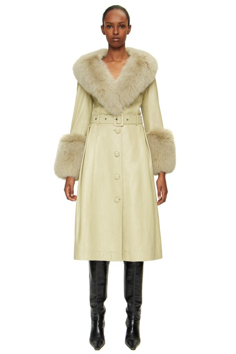 The foxy coat is a signature style by Saks Potts The elegant silhouette is an expressive, yet, timeless piece Features high-quality lamb leather and ultra-fine fox fur trimming Waist belt, button fastenings through front and slip side pockets Lined with SP white and black logo print The fox fur is responsibly sourced via Kopenhagen Fur Black Black-Gloss Walnut Brown-gloss Beige Beige-gloss Shortbread Sage Forest Red Wine...