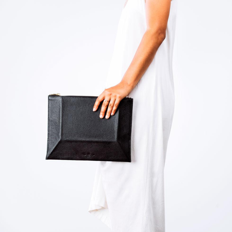 Constructed of Italian Pebble Leather with a duck canvas lining and gold hardware. Folds imitate a faceted stone structure. Made in NYC!