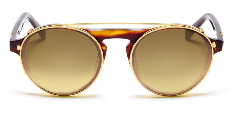 Golden caramel: Dyad 15 features a unique clip with brown gradient lenses in polished gold wire. The frame is caramel gradient acetate, hand-polished to a perfect finish. Super gold side inlays complete the classic look. The frame itself features clear lenses, and is RX friendly, should you wish to add your prescription. Additional clips are available in our accessories section.